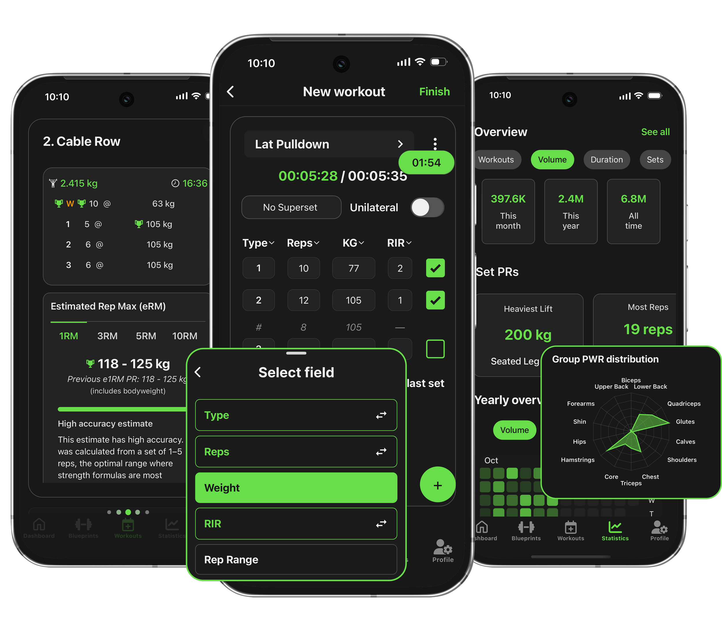 See your PRs, Rep Max estimates, RIR, RPE, and more.